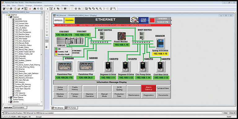 Figure 1 shows an Ethernet network layout: PLC communicating with HMI drives, power monitors, and the SCR drives different colored backgrounds, to indicate status of the network, connected through Ethernet switches.